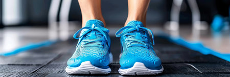 Close-up of Womans Feet in Modern Blue Athletic Shoes on a Gym Floor, Fitness and Exercise Concept