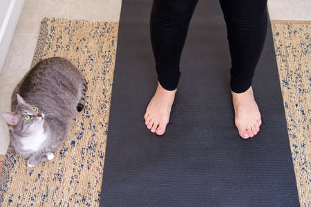 Cat looks at a man's workout at home on the carpet, legs close-up. The concept of sports training at home