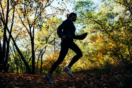 runner caucasian woman jogging in autumn park, silhouette out of focus