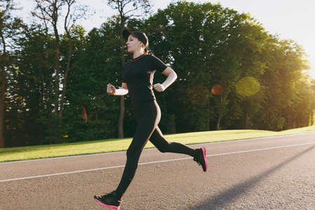 Young athletic girl in black uniform and cap training, doing sport exercises, running, looking straight on path in city park outdoors on spring or summer sunny day. Fitness, healthy lifestyle concept