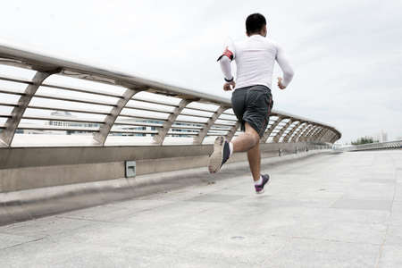 Attractive fit man running along modern bridge. Exercising, Jogging, Sport. Male athlete running.