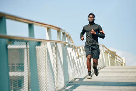 Fit handsome young Black sportsman jogging on bridge in the morning