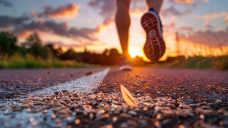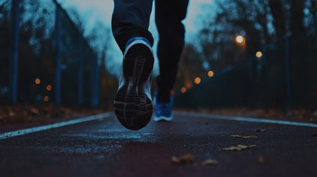 Close shot of runner's legs and shoes on track at dawn, vibrant fitness lifestyle scene.