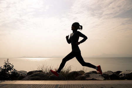 Healthy lifestyle fitness sports woman runner running on seaside trail