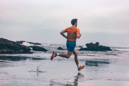 Exercise outdoor athlete man running on wet sand at beach training cardio sprinting fast. Profile of runner in sportswear clothes jogging