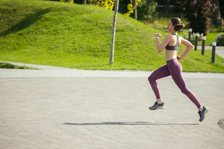 Morning jogging the girl on the background of a beautiful sky. Girl running on the evening park. Running on fresh air. Healthy sport.