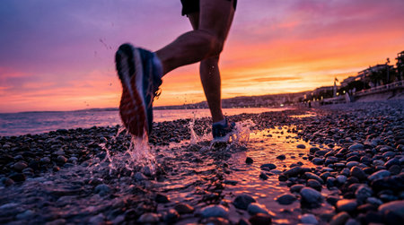 Close-up view of a runner's legs and feet splashing water while running along a wet, pebbled shoreline during twilight hours.