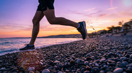 The lower body of a runner wearing dark athletic shorts and running shoes is shown mid-stride on a dark pebble beach near the ocean during sunset or sunrise.