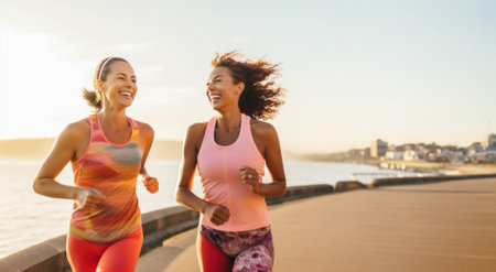 Two women jogging, Healthy lifestyle and companionship celebrated with a seaside run at sunrise..