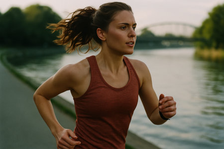 Woman runs along a riverbank, focused on her fitness routine. the scene captures an active and healthy lifestyle outdoors.