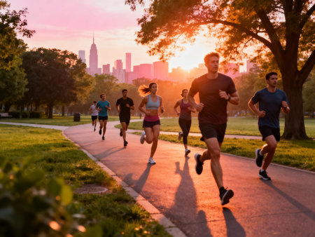 Happy friends in athletic outfits happily jogging at sunrise in a scenic park setting