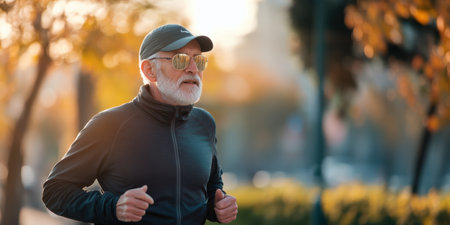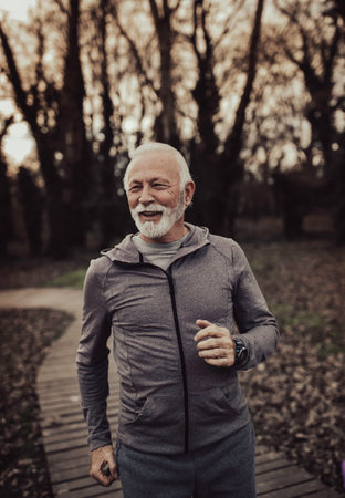 Senior man jogging in the city park during autumn