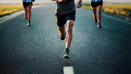 Marathon runners running on country road. Healthy lifestyle and fitness concept.