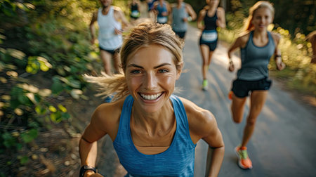 healthy beautiful woman with a smile runs a marathon, with blurred runners in the background