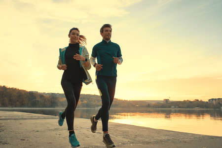 Motivated couple of runners out for a run on the lake at the sunrise. Young man and woman in sport clothing, running together. Sportive people training outdoors