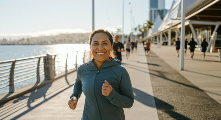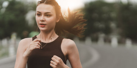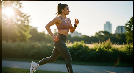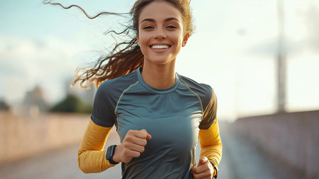 Young energetic woman jogging on sunny day outdoors, smiling and enjoying run. Sport concept. Generative AI