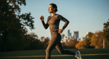 A woman in athletic wear running on a path in a park at sunset, with city skyline in the background.