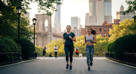 Two women running on a path in Brooklyn Bridge Park, with the Brooklyn Bridge and New York City skyline in the background.