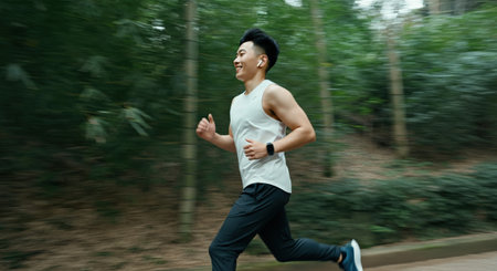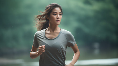 Healthy Asian woman is jogging outdoor. Fitness girl running. Female exercising at outdoor park