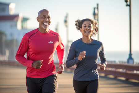 Front view of a happy mature couple running together on a sunny day, Active fit mature couple running on Santa Monica Beach boardwalk pacific ocean in background, AI Generated