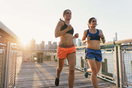 Two female runner friends running on dockside
