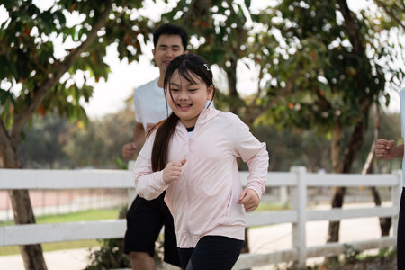 Living a healthy life Full length of cheerful father and daughter in sports clothes jogging at the riverbank together : Generative AI
