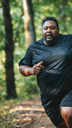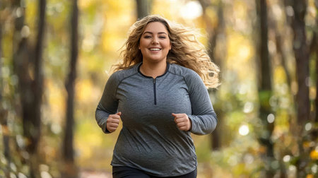 Beautiful Curvy Woman Jogging Through Autumn Woods with Hope, Health, and Determination