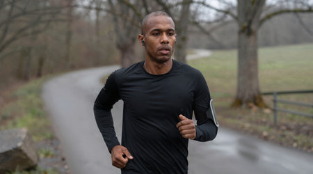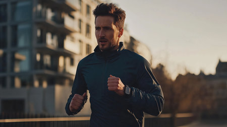 A man is running outdoors wearing a smartwatch. He is dressed in athletic gear, and the sun is setting behind him. High quality photo
