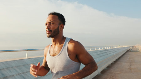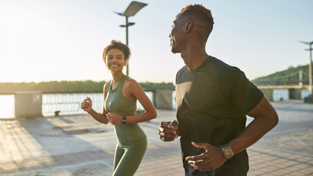 Starting new day from morning jog. Young african couple in sportswear jogging together on the bridge in the early morning
