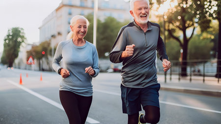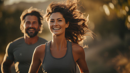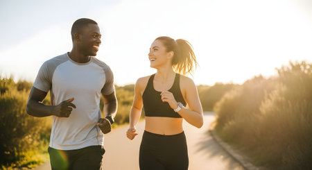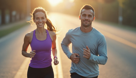 A fit man and woman are running side by side on a sunlit road, radiating happiness and energy. Their smiles and athletic attire reflect a vibrant lifestyle, capturing the essence of companionship and fitness in a beautiful outdoor setting.
