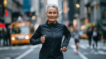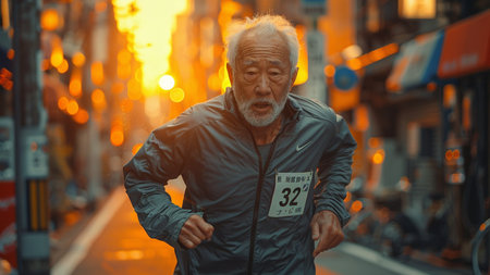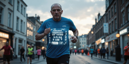 Elderly Athlete Competing in a Smart Marathon with Biometric Data Display A fit senior marathon runner wears a high-tech fitness