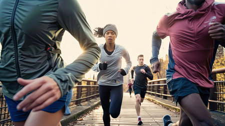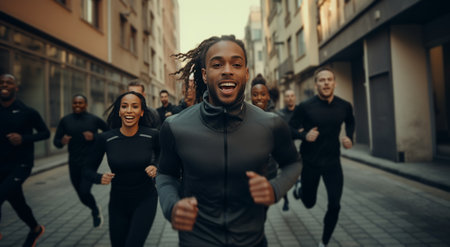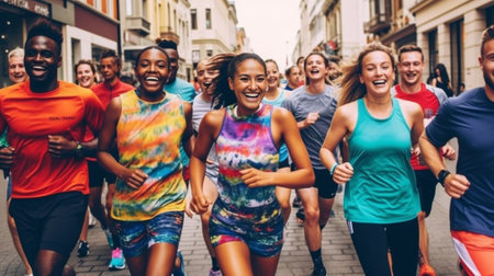Group of young people in sports clothing jogging together outdoors. AI Generated.