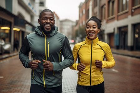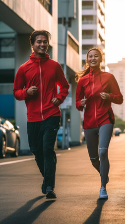 Morning jog Young couple in sport clothing running through the city street together : Generative AI
