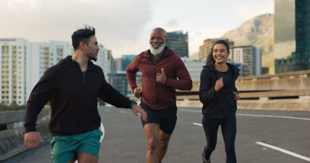 Runner group, friends and city on road with talking, progress and happy for fitness, health and wellness. Men, woman and conversation on metro street for workout, training and exercise in Cape Town