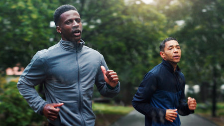 Fitness, rain and athlete running at park for marathon training, endurance or discipline with workout performance. People, teamwork and cardio with morning exercise, sports challenge and wellness