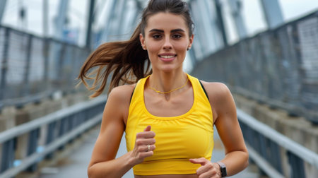 A young woman in a vibrant yellow sports bra runs energetically on an urban bridge, demonstrating fitness and vitality. The wind enhances her motion and joy.