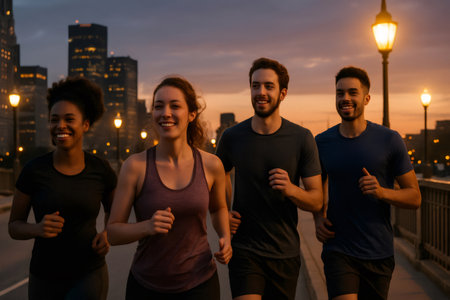 Four happy friends are jogging together on a bridge at dusk, enjoying their workout and the cityscape