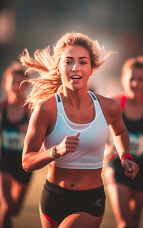 A young Caucasian female athlete running in a sports event, AI-generated.