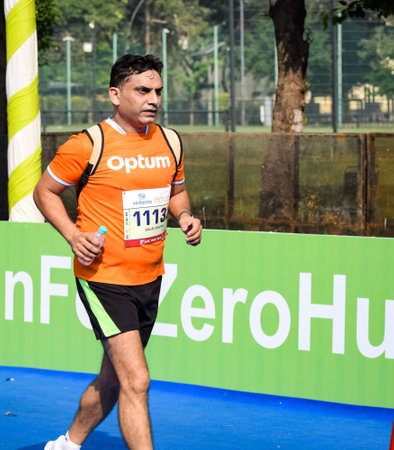 New Delhi, India - October 16 2022 - Vedanta Delhi Half Marathon race after covid in which marathon participants about to cross the finish line, Delhi Half Marathon 2022