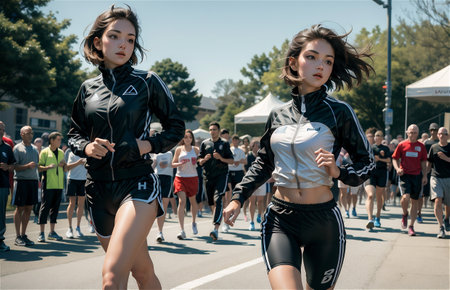 Runners are joyfully participating in a marathon, showcasing determination and teamwork in a bustling city environment, surrounded by cheering spectators and vibrant attire. Generated AI. This is a fictional character not a real person
