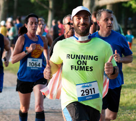 North Babylon, New York, USA - 8 July 2019: Runner racing a 5K at a State Park gives two thumbs up and is wearing a cape while running a race.