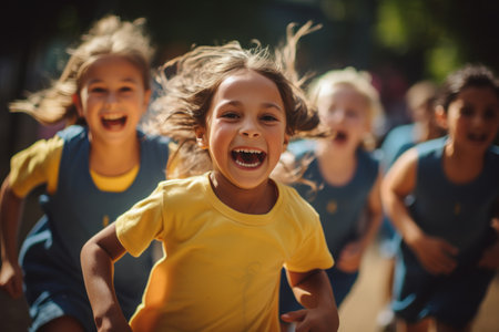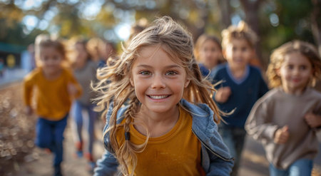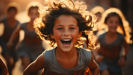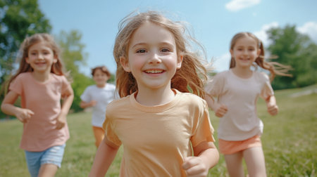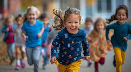 Children running and laughing outside on a sunny day. A group of happy kids are enjoying their time together.