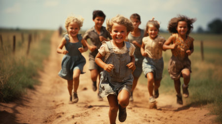 Group of six happy children running on a dirt path in a rural area, capturing a joyful and carefree moment with a vintage, retro feel.