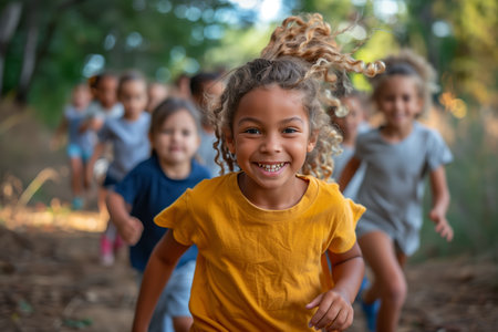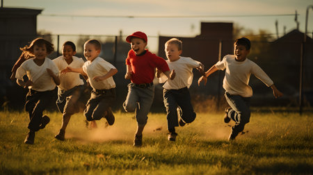 Group of diverse kids running in a park. Exciting outdoor fun activity