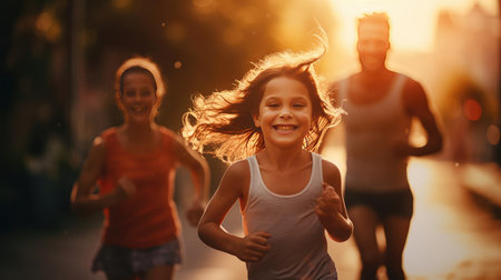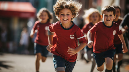 In the early morning light, children racing in a kids' race on a city street while focusing on their legs, Generative AI