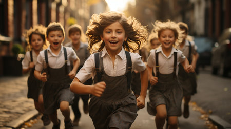 A lively group of children joyfully running down the street together, kids running school, AI Generated