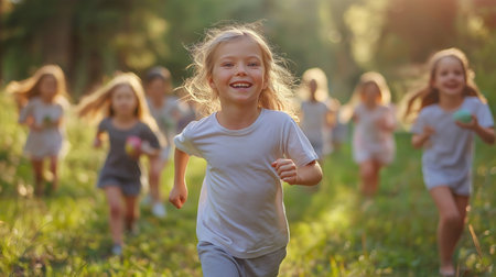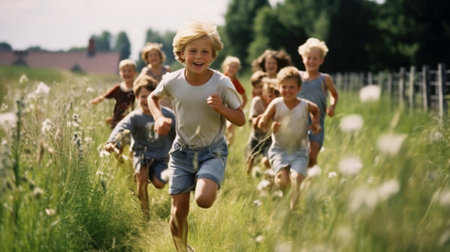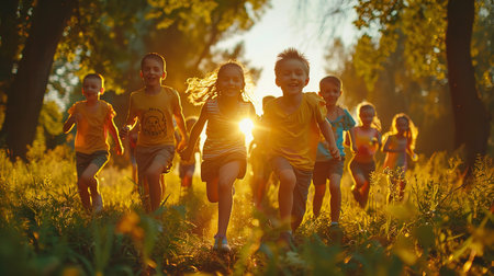 Children running joyfully in a sunlit meadow during a warm afternoon in late summer