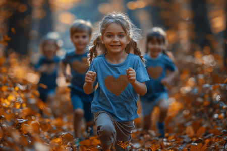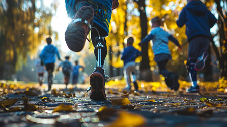 Disabled Runner with Prosthetic Leg Participating in a Race with Excited Children in an Autumn Park Setting with Colorful Foliage and Natural Scenery