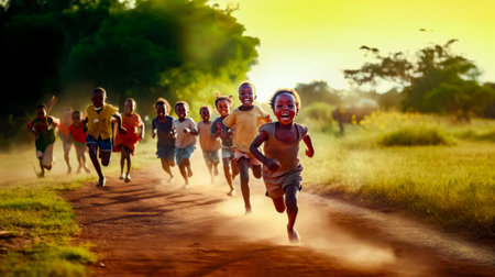 Group of children running down dirt road in line with trees in the background. Generative AI.