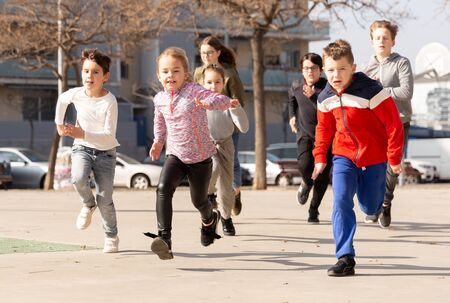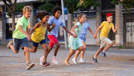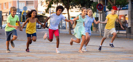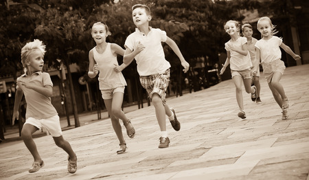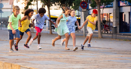 Group of children running on city street and having fun